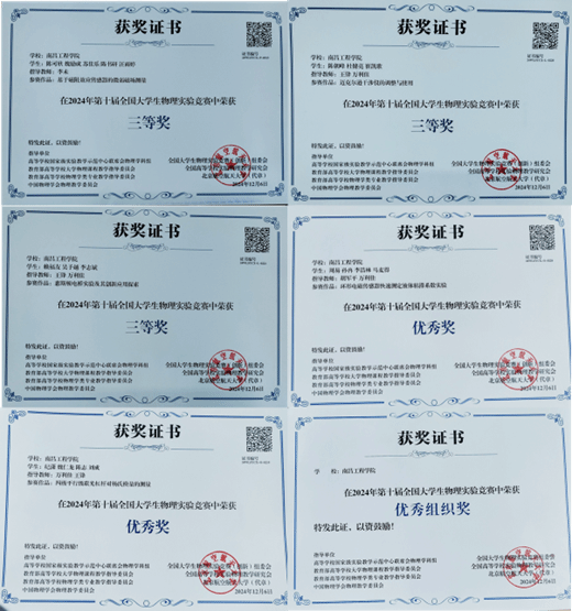 近日,由高等学校国家级实验教学示范中心联席会物理学科组、教育部高等学校大学物理课程教学指导委员会、教育部高等学校物理类专业教学指导委员会、中国物理学会物理教学委员会、全国大学生物理实验竞赛(创新)组委会、全国高等学校实验教学研究会主办、北京航空航天大学承办的2024年全国大学生物理实验竞赛(创新)圆满结束。经过激烈角逐,我校代表队共获三等奖3项,优胜奖2项,同时学校荣获“优秀组织奖”。